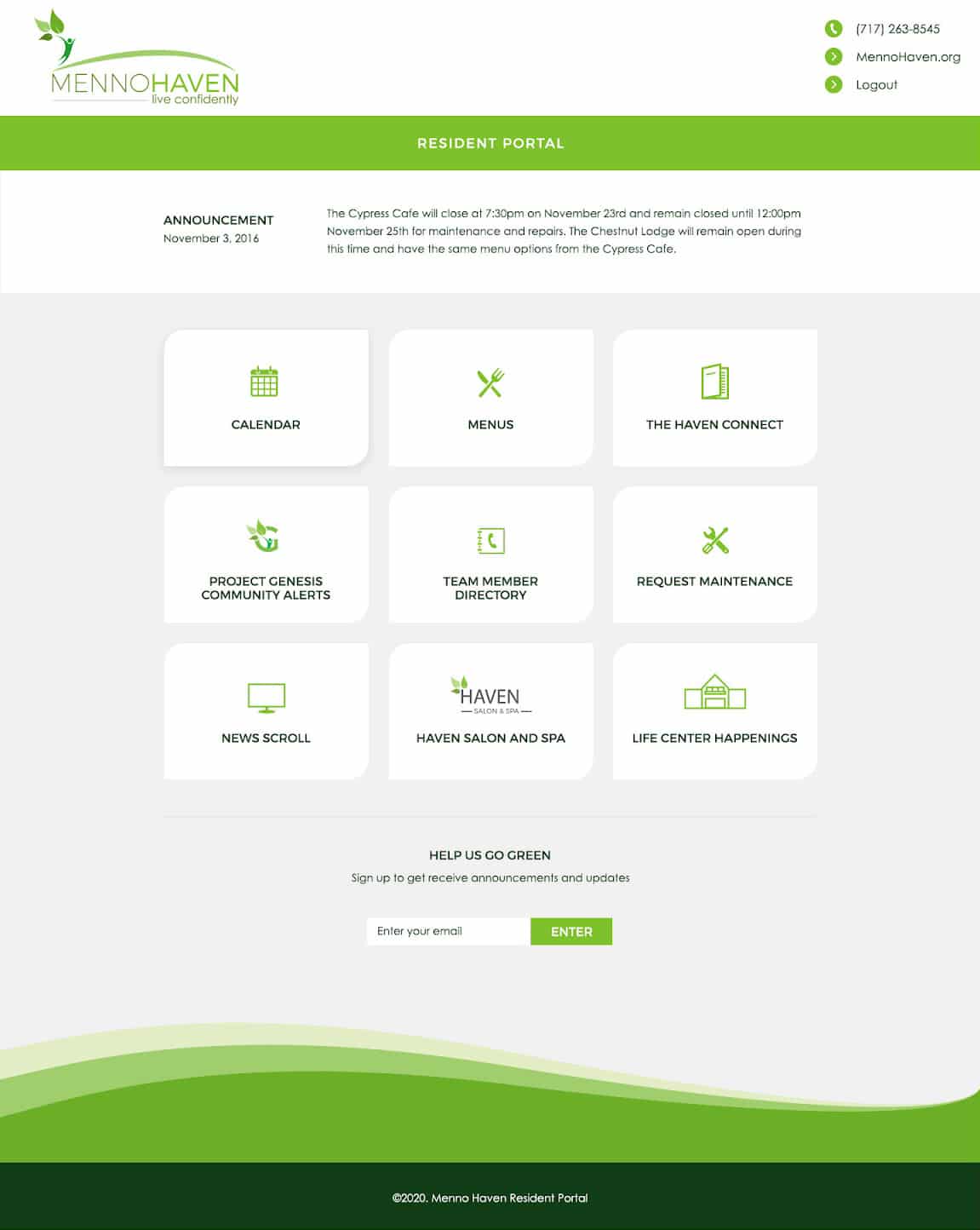 Menno Haven is a retirement community in south-central Pennsylvania serving residents on three campuses. This is a great example of an organization using intranet design to effectively communicate with members. Menno Haven needed a central location for residents to access important information such as news and events, current menus, maintenance requests, and general community announcements.