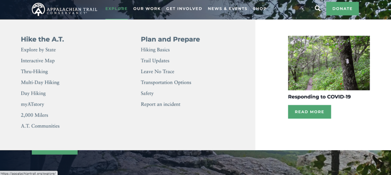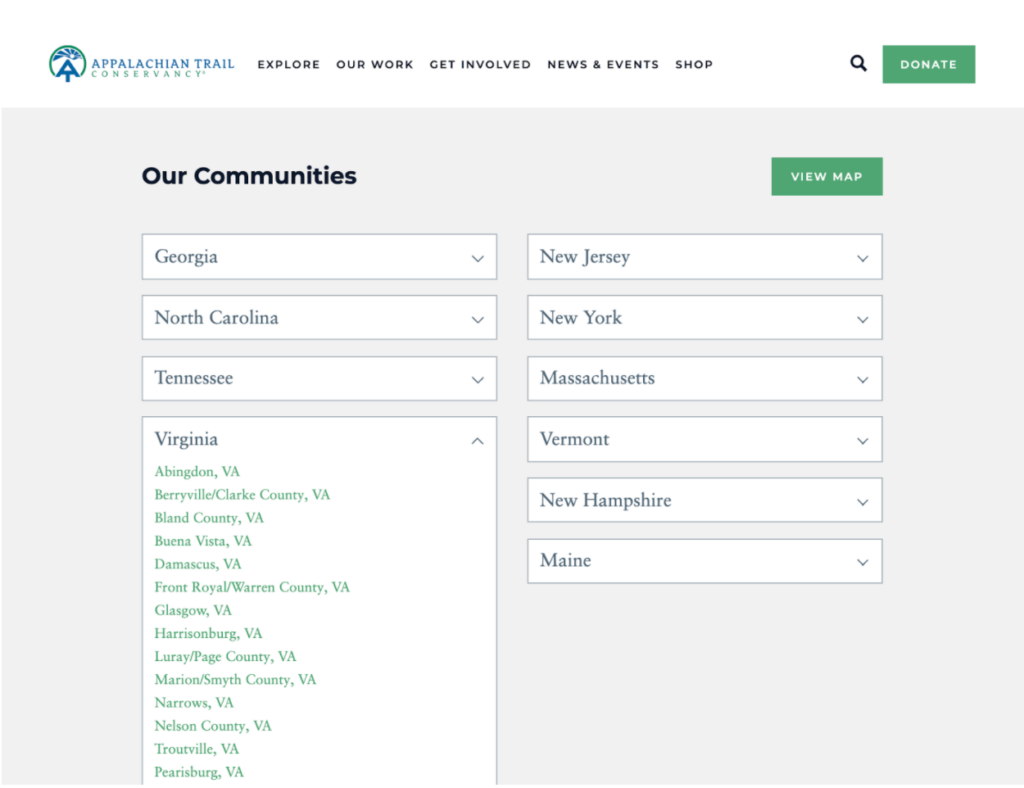 When we designed the website for the Appalachian Trail Conservancy, site navigation was a top priority. We worked together to organize the content in such a way that each marketing persona can easily find what they’re looking for. There are links full of content geared toward hikers, donors, educators, and friends of the trail who want to stay up-to-date on the latest news and information.