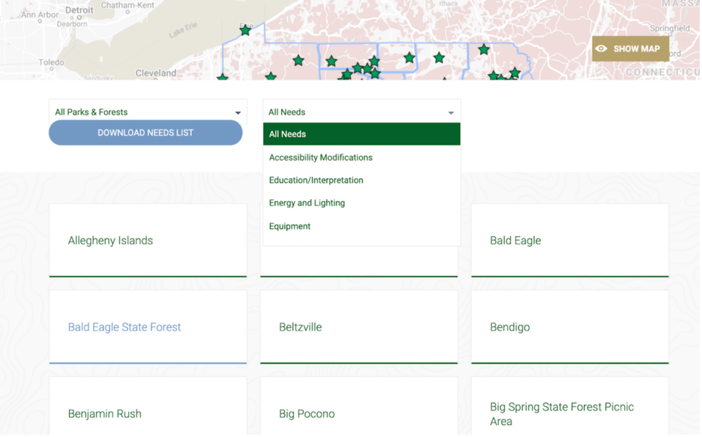 When we worked with the Pennsylvania Parks & Forests Foundation on their website, they wanted a way to present a specific list of needs to the community organized by parks, forests, region, and need type. We built a custom solution that displays the information in a nice, clean format making it easy for supporters to navigate to a specific need in a location of their choosing.