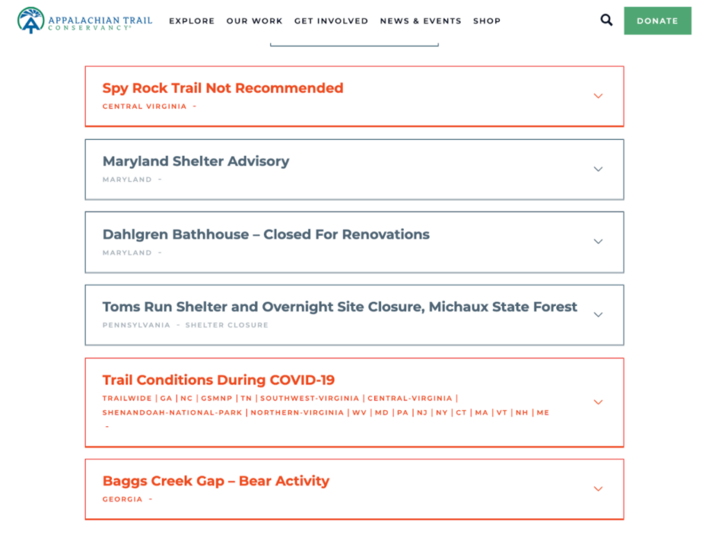 This advice applies to every website, but do everything you can to make it easy for website visitors to take the next step with you. Prominently display where to sign up for your e-newsletter. Consider creating a lead offer in exchange for a visitor’s email address. Display social media icons so visitors can effortlessly engage with you on these platforms. The Appalachian Trail Conservancy makes it easy for hikers to stay connected through a section on their website called “trail updates.” This area was made to be clean and simple for backpackers to navigate so they can get the latest news and information in real time while out on the trail.