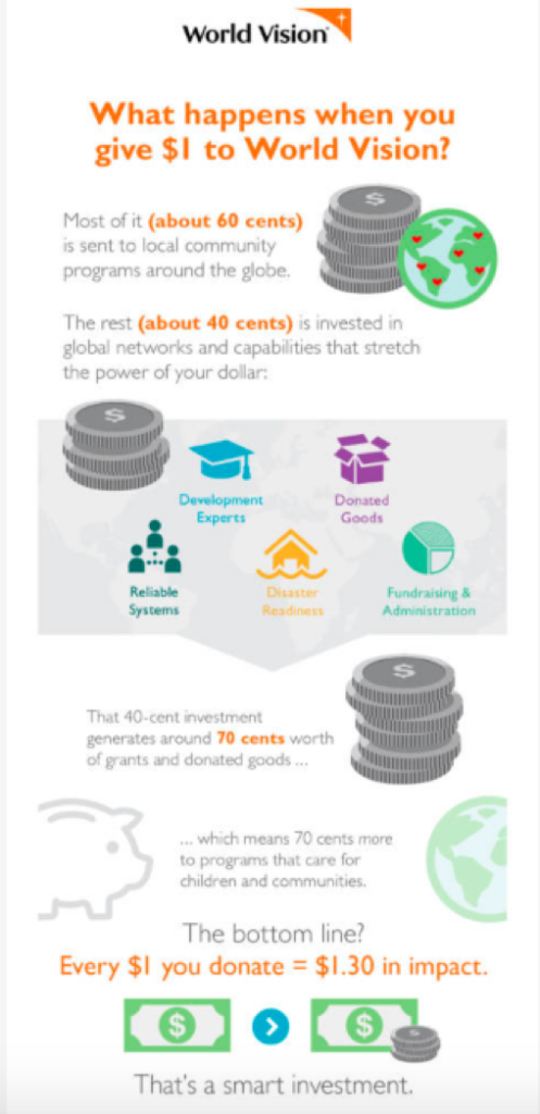 World Vision is a nonprofit who consistently gets this right. Below is an example of effective use of imagery to clarify the financial breakdown of child sponsorship.