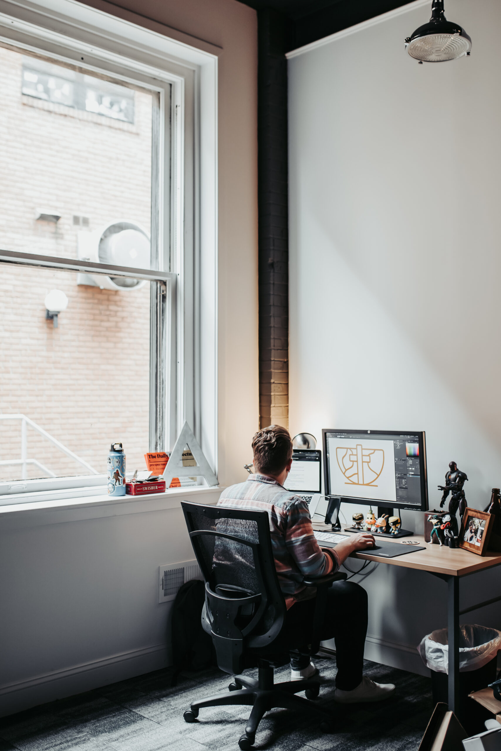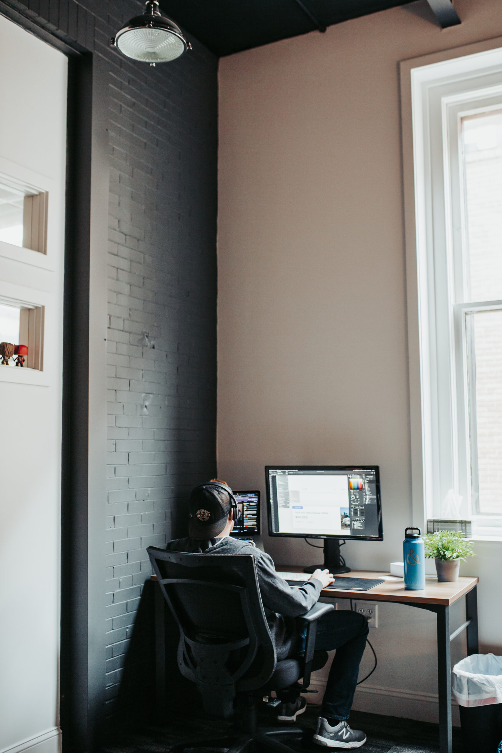 Our high ceilings and exposed brick creates an airy atmosphere to work in, along with large windows to let in natural outside light.